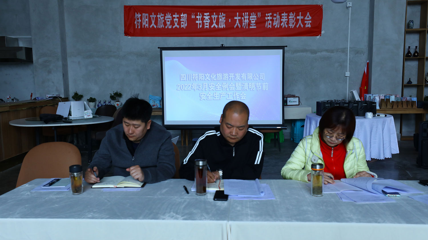 2022 年 3 月 24 日 , 符 陽 文 旅 公 司 召 開 3 月 安 全 生 產(chǎn) 工 作會。 總經(jīng)理吳平主持會議, 全體員工參加。 會上, 譙棣升 董事長圍繞交通運輸安全、 在建項目安全、 森林防滅火安全、 地質(zhì)災(zāi)害防范、 酒店經(jīng)營安全等幾個方面作了講話, 強(qiáng)調(diào)每 個員工都有安全責(zé)任, 發(fā)現(xiàn)違章作業(yè)要大膽制止, 保證安全 生產(chǎn)。