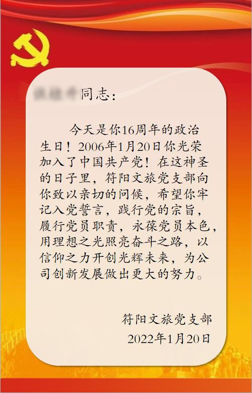 為進(jìn)一步強(qiáng)化黨員黨性教育,增強(qiáng)黨員政治身份認(rèn)同感,發(fā)揮黨員先鋒模范作用,符陽(yáng)文旅黨支部為每位黨員過(guò)好...
