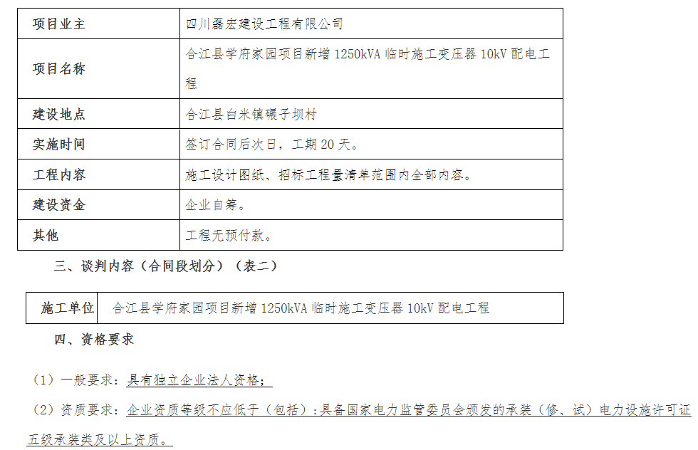 一 、 本 次 談 判 項(xiàng) 目 合 江 縣 學(xué) 府 家 園 項(xiàng) 目 新 增 1250kVA 臨 時 施 工 變 壓 器 10kV 配 電 工 程 施 工 單 位 , 現(xiàn) 通 過 競 爭 性 談 判方式選擇和確定承包人,誠邀符合資格條件的潛在申請人參與本項(xiàng)目的競爭性談判。