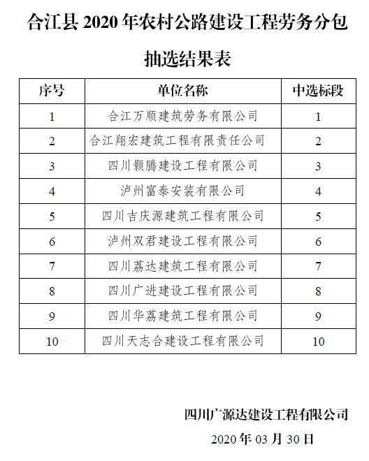 合江縣2020年農(nóng)村公路建設工程勞務分包抽選結(jié)果表