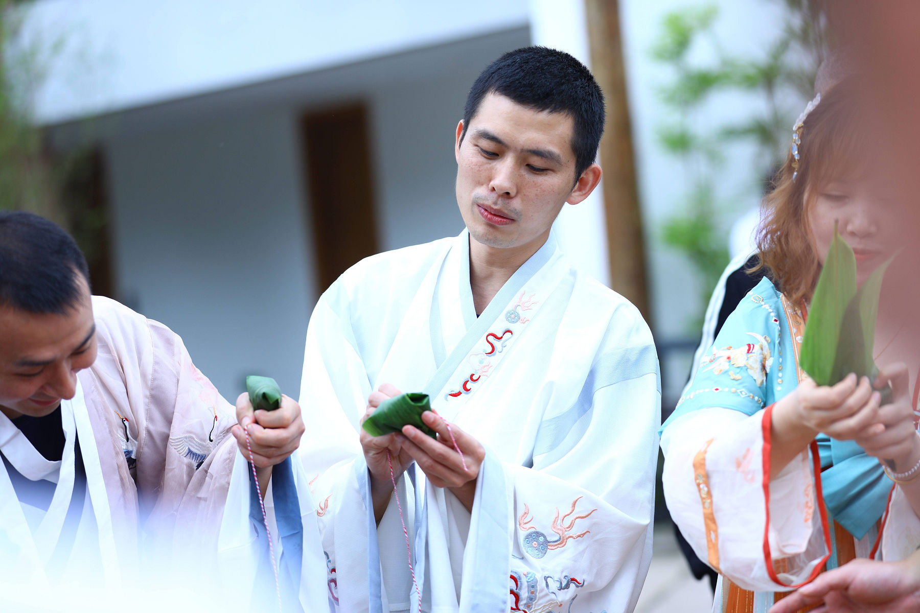 龍掛山景區(qū)是阜陽集團(tuán)下屬符陽文旅公司打造的的文 化休閑度假旅游目的地, 景區(qū)云霧如海, 美景如畫, 建筑獨 具傳統(tǒng)川南民宿特色。 活動中, 阜陽集團(tuán)員工身著漢服, 人 與自然情景交融、交相輝映,仿若穿越到了“狗吠深巷中、 雞鳴桑樹顛”的古代美好田園生活。在見禧 . 山語的院子里, 大家圍成一圈, 開展包粽子比賽。 員工們踴躍參加、 興致高 漲, 集團(tuán)總經(jīng)理任東財和員工們一起動手, 互相學(xué)習(xí)、 邊學(xué) 邊包、 比拼手藝, 包出了三角形、 長方形、 圓錐形等形態(tài)各 異的粽子,現(xiàn)場洋溢著歡樂的節(jié)日氣氛。